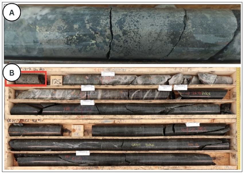 Figure 4 – Hole BR25-002 at 125m. (A) Closeup of massive pyrrhotite > chalcopyrite in skarn zone approaching contact with a thick granodiorite dyke. Interval 124.7- 126.5 contains 1.51% CuEq.