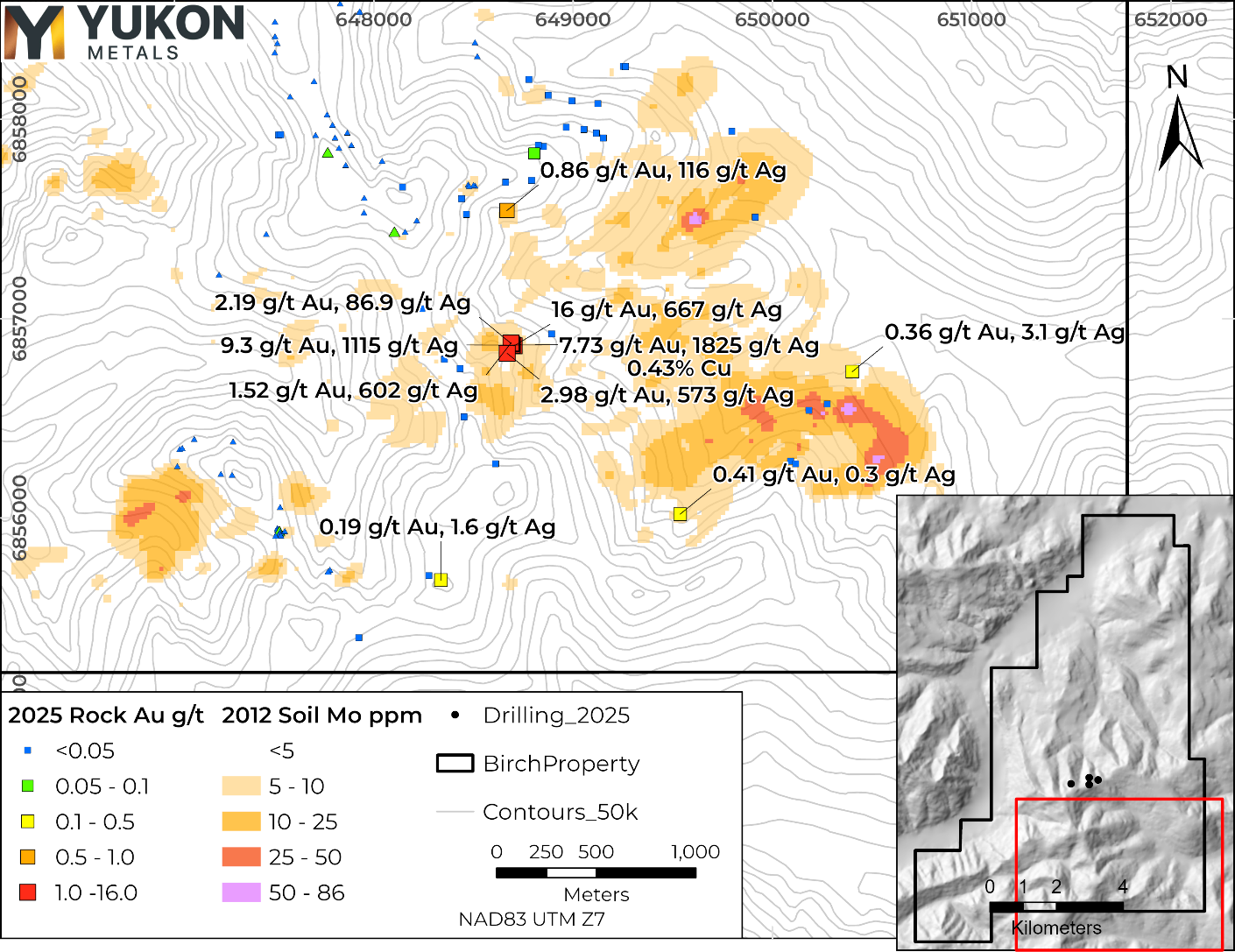 Figure 8 – Location of 2025 Rock Samples collected near the soil molybdenum anomaly on the southeast portion of the Birch property. 2024 Rock Samples are shown with triangle symbols.